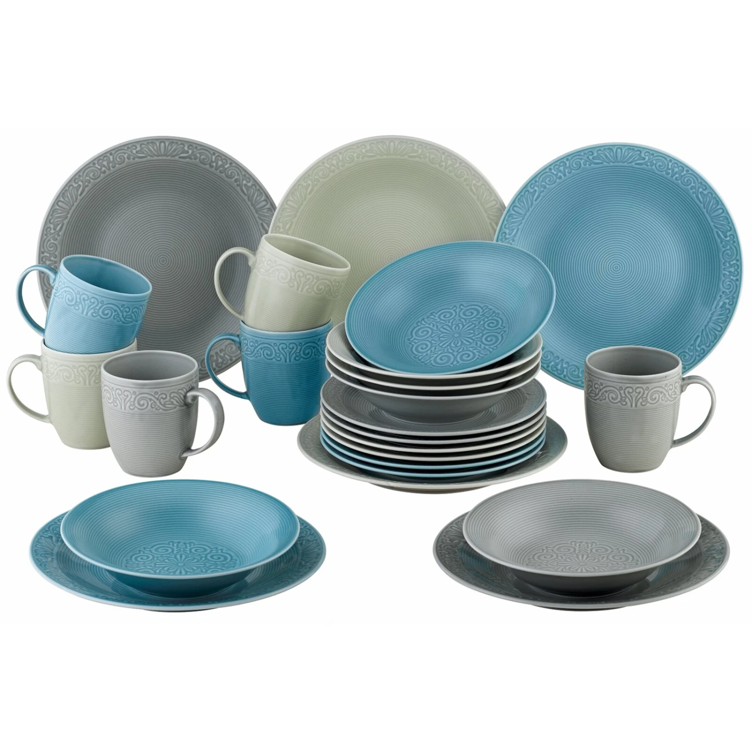 Das 24-teilige Kombiservice wird auf Ihrem Esstisch eine hervorragende Figur machen und für ein modernes Ambiente sorgen. Die Farben Grau, Aqua und Beige sind im Zusammenspiel eine erfrischende Farbenpracht und runden die Optik mitsamt der tollen Struktur stimmig ab.