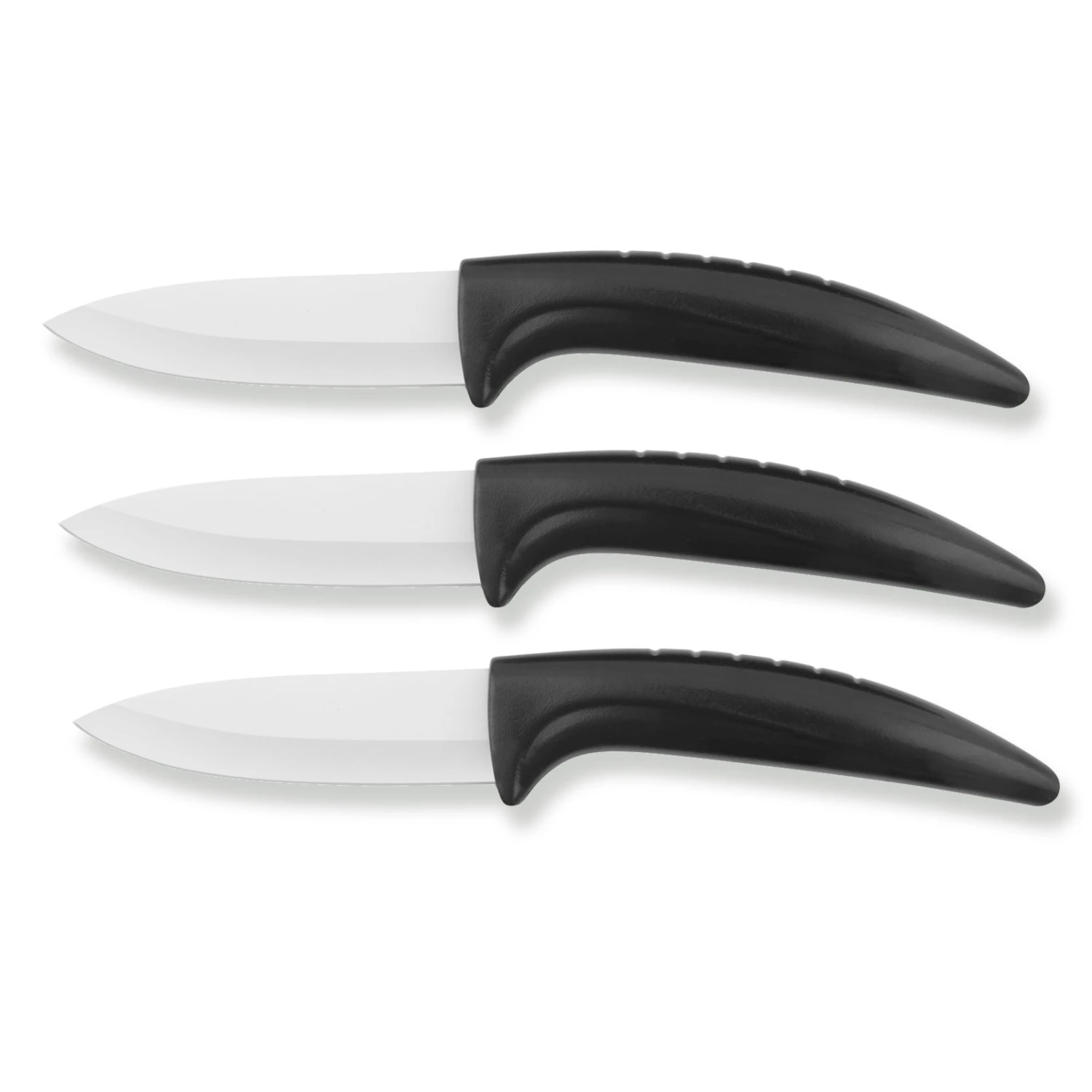 3-teiliges Keramik-Messerset mit je einer Gesamtlänge von ca. 17,5 cm. Der Griff ist in Schwarz gehalten und liegt mit der Form gut in der Hand.
