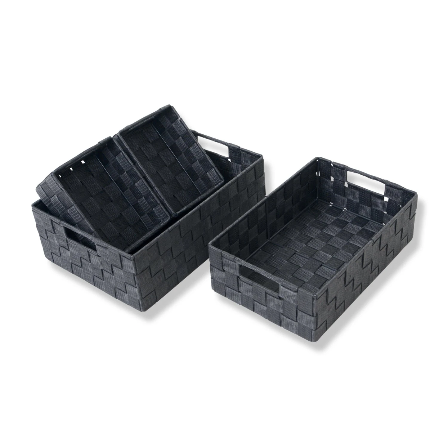 Vier praktische Aufbewahrungsboxen aus Polypropylen-Geflecht in verschiedenen Größen