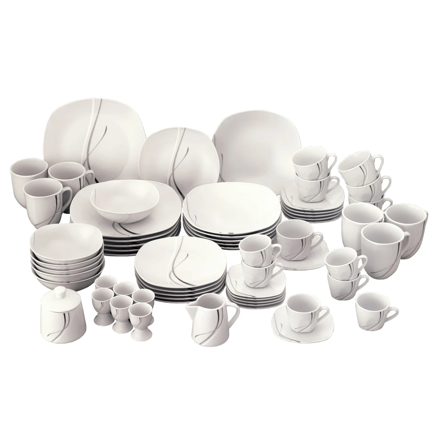 Mit diesem umfangreichen Porzellan Tafelservice haben Sie alles, was Sie für einen stilvoll gedeckten Tisch benötigen, egal ob Frühstück, Kaffeekranz oder Abendtafel. Das Set besteht aus 62 Teilen und ist sowohl spülmaschinen- als auch mikrowellengeeignet. Das Dekor in Weiß mit dezenten grauen Linien ist zeitlos schön.