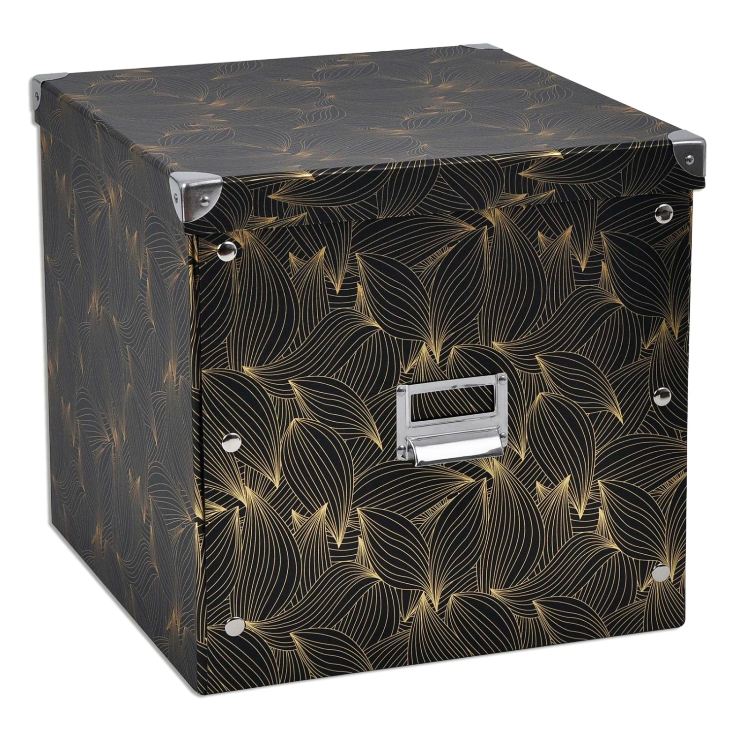 Aufbewahrungsbox mit einer Grafik in edlem Gold und Schwarz. Die Box eignet sich vom für die Aufbewahrung von allerlei Dingen und wird Ihnen beim Ordnung halten helfen. Mit einem Deckel können Sie die Box verschließen. Das Design lässt sich vielseitig kombinieren und wird ein Blickfang in Ihrem Regal sein.