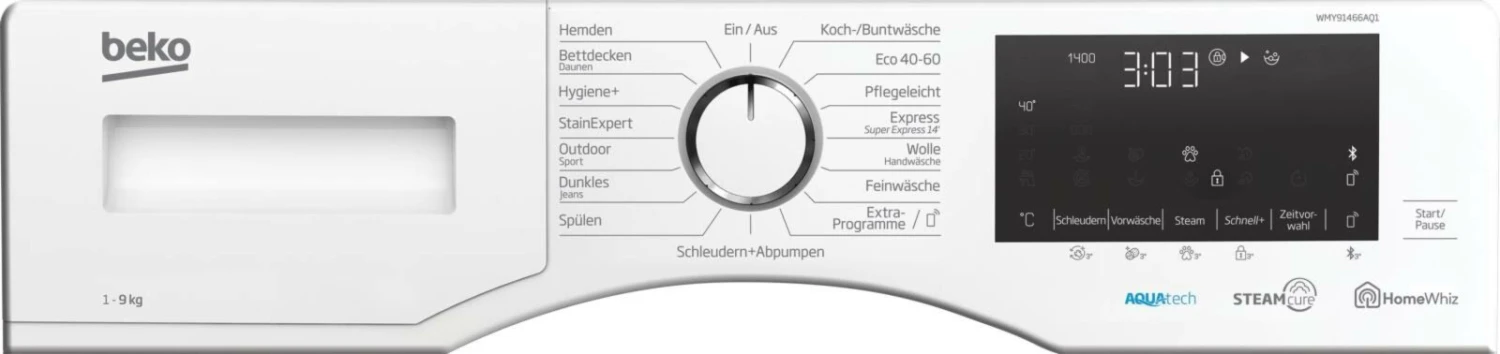 Die BEKO Waschmaschine WMY91466AQ1 ist mit 9 kg Beladungskapazität ideal für Haushalte, die große Wäschemengen zu bewältigen haben. Mit der variablen Schleuderdrehzahl bis zu 1400 U/Min oder der individuellen Startzeitvorwahl bis zu 24 Stunden werden Sie diesen Haushaltshelfer nicht mehr missen wollen. Mit der neuen AquaTech-Technologie waschen Sie dank der Kraft des Wassers bis zu 50% schneller bei gleichbleibender Waschleistung. Außerdem wird die Textilabnutzung ebenfalls um bis zu 50% reduziert. Die Zusatzfunktion Pet Hair Removal berücksichtigt sogar Ihre Haustiere. Zudem bietet das Gerät mit dem StainExpert-Spezialprogramm eine besonders effektive Lösung gegen 24 verschiedene Flecken-Typen. Alle Programme lassen sich bequem via Bluetooth einstellen, steuern und überwachen (App erforderlich). Die App bietet zudem noch 5 weitere Programmfunktionen. Dank AddXtra-Nachlegefunktion macht es auch nichts, wenn mal ein Kleidungsstück vergessen wurde. Auch die SteamCure-Dampffunktion erleichtert Ihnen das Leben, indem Flecken vor dem Waschen aufgeweicht werden und Knitterbildung vermieden wird. Die Aquawave-Schontrommel schont dabei Ihre Wäsche und Watersafe+ sorgt für Ihre Sicherheit – und das alles bei Energieeffizienzklasse A. Der ProSmart Inverter Motor bietet nicht nur eine 10-jährige Motorgarantie, sondern ist auch deutlich leiser als herkömmliche Motoren.