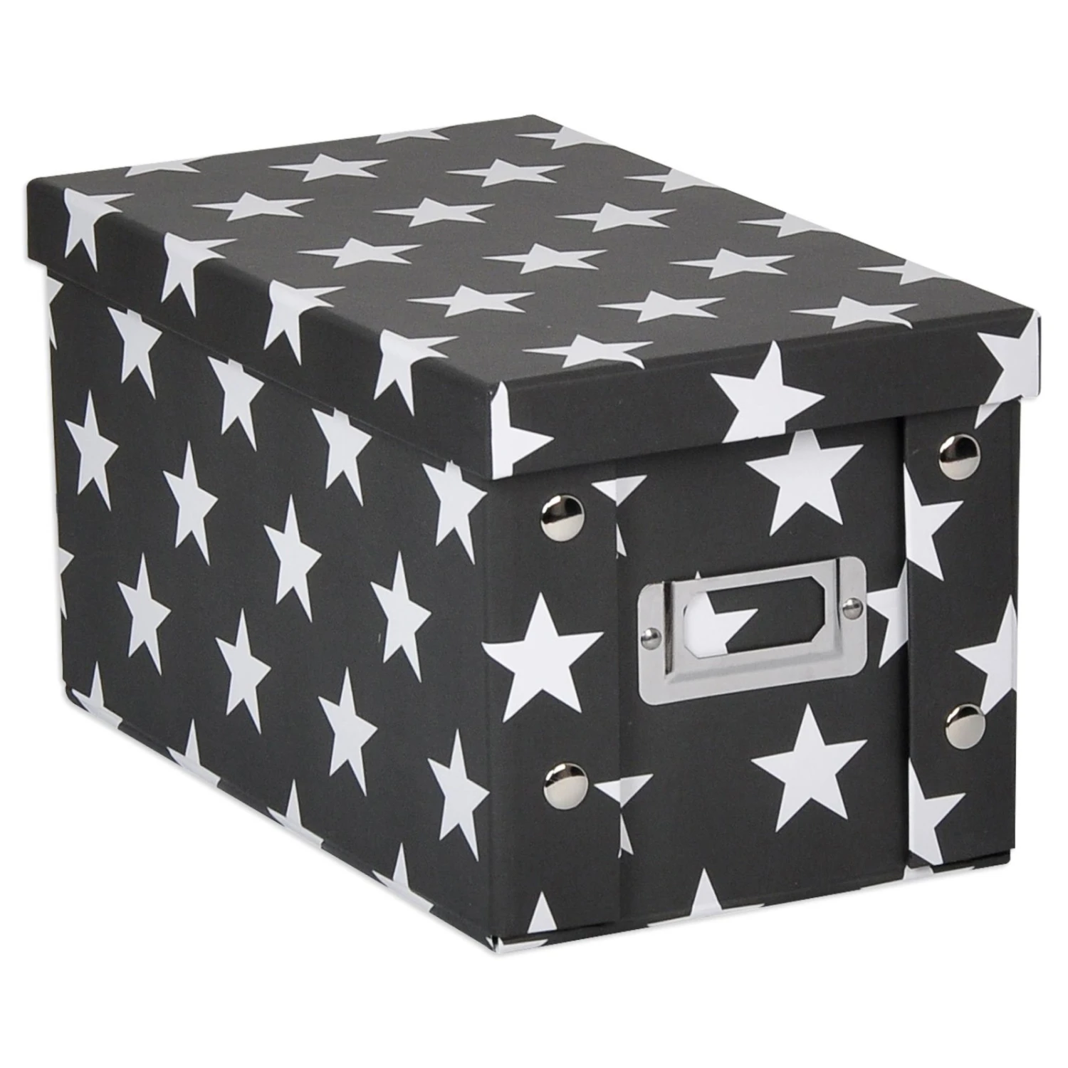 Praktische Box im schönen Sternen Design in Schwarz und Weiß. Die CD-Aufbewahrungsbox hat das passende Format zur Aufbewahrung Ihrer CDs. Um den Überblick zu behalten können Sie vorne einen kleinen Zettel mit Notizen einschieben.