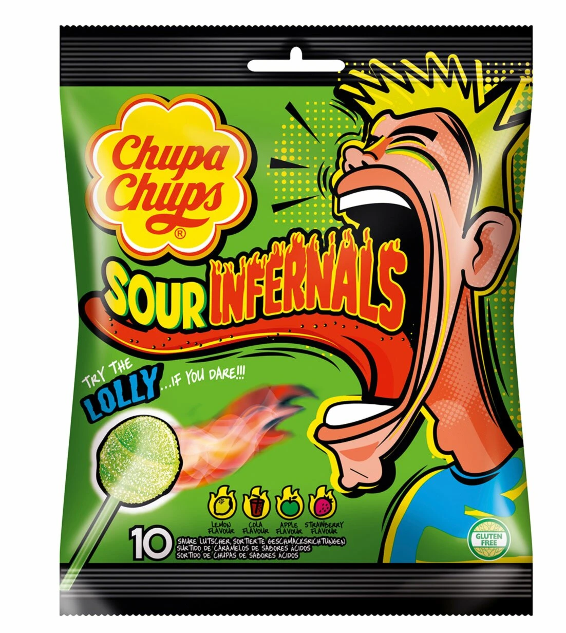 Wer Lolli sagt, meint Chupa Chups! Die Klassiker von Chupa Chups verfärben beim Lutschen deine Zunge in den Farben der jeweiligen Geschmacksrichtung. Wer eine Alternative zu sauer sucht , kommt mit „Chups-Chups Sour-Infernals“ auf seine Kosten. Diese Sorte bringt deine Geschmacksnerven auf Hochtouren und sorgt für eine Geschmacksexplosion – nicht für schwache Geschmacksnerven! Erhältlich in praktischen 10er und 20er Beutel, passen die Lutscher in jeden Rucksack und jede Handtasche.