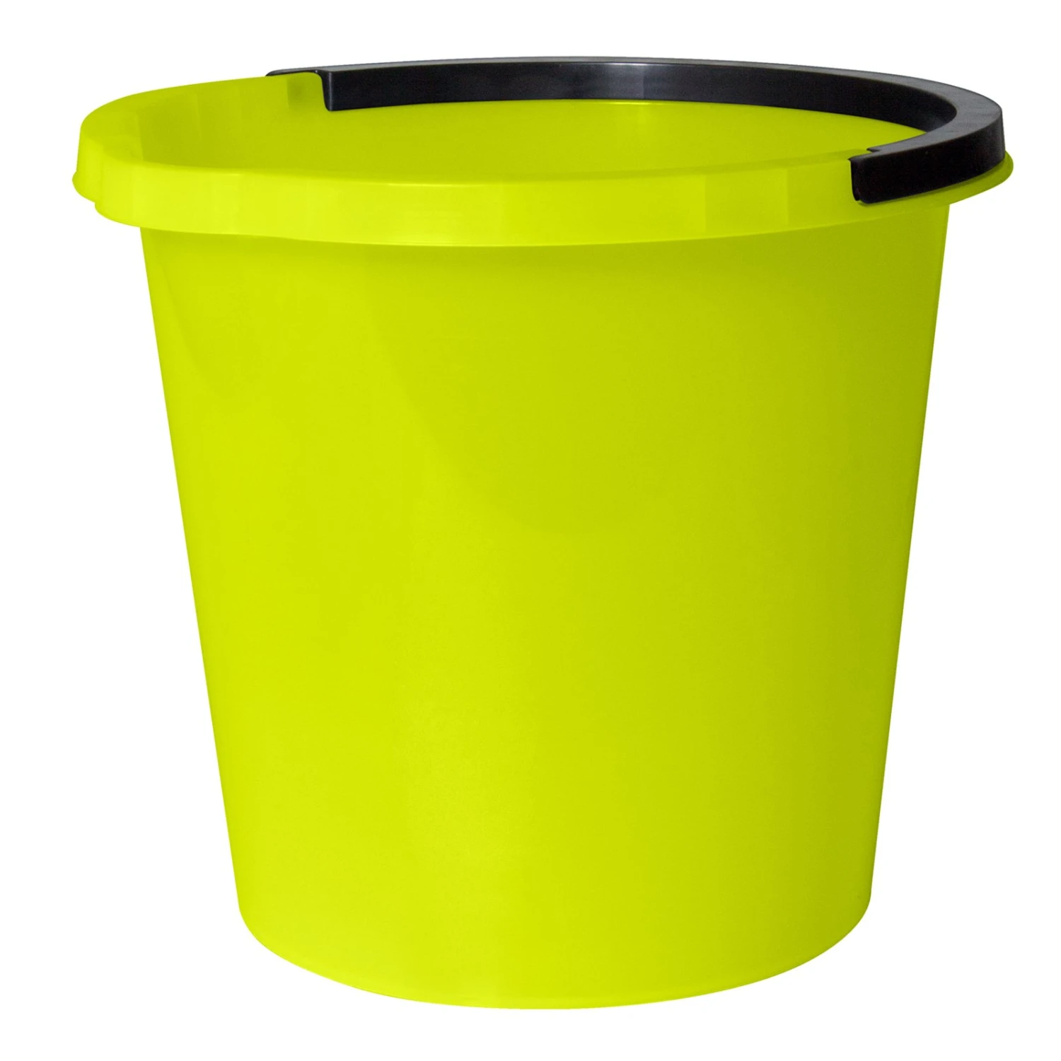 Grüner Eimer mit Ausgusslippe und einem Fassungsvermögen von 10 Litern. Der Durchmesser beträgt 27,7 cm.