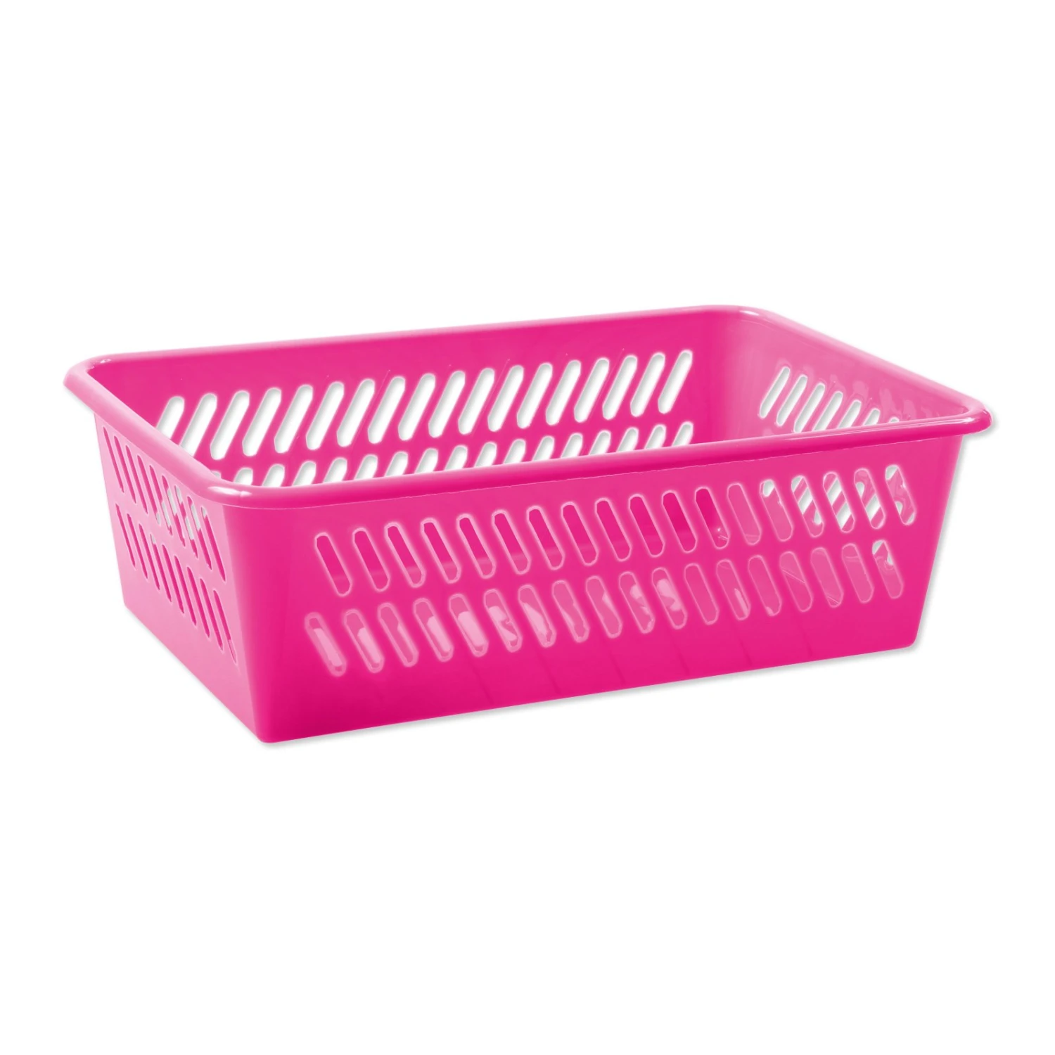 Farbenprächtiger Haushaltskorb in der Farbe Pink aus robustem Kunststoff zum Sortieren und Ordnen von Haushaltsgegenständen.