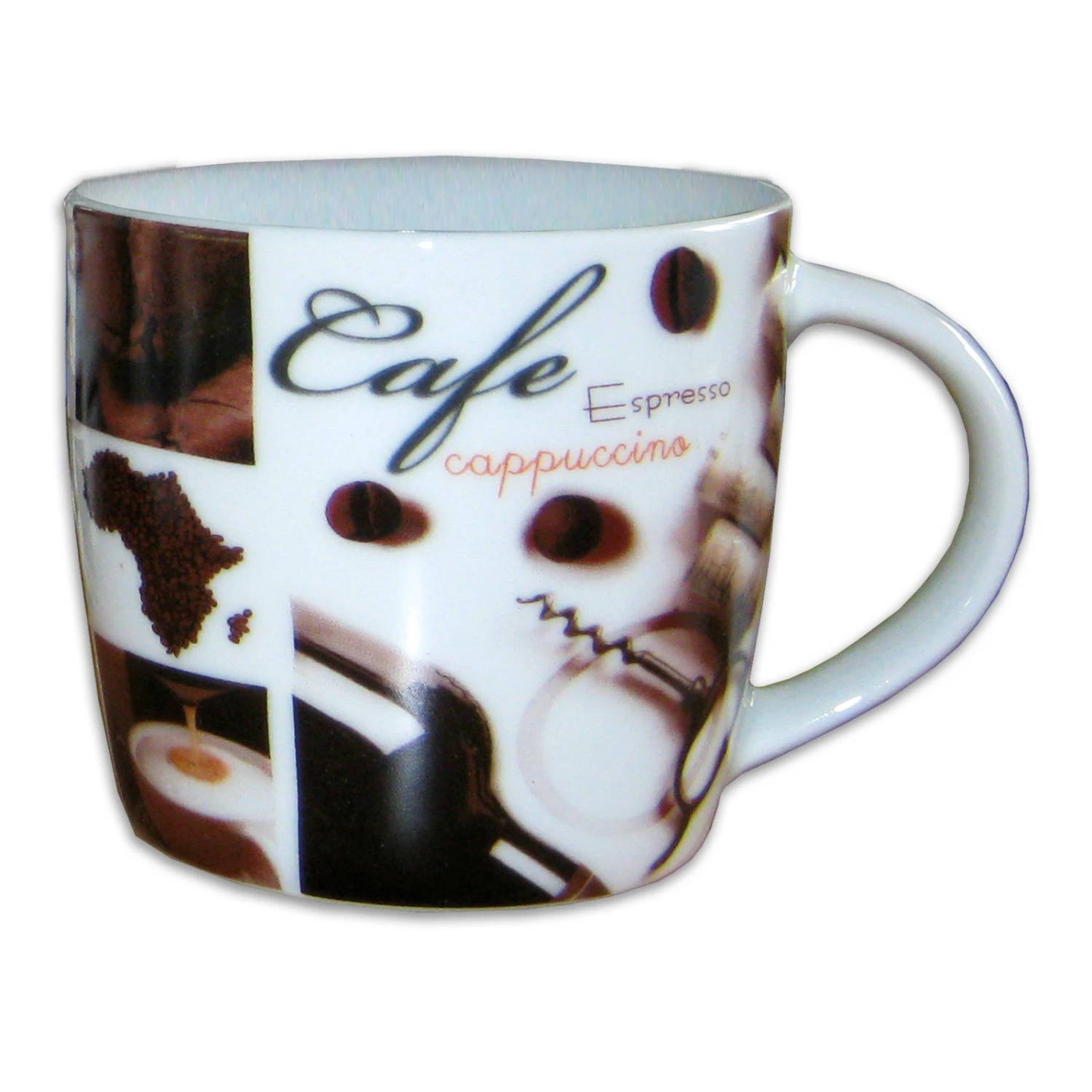 Schöne Kaffeebecher in sechs verschiedenen Designs. Die Tassen aus Porzellan haben ein Fassungsvermögen von ca. 335 ml und eine Höhe von ca. 8,4 cm.
