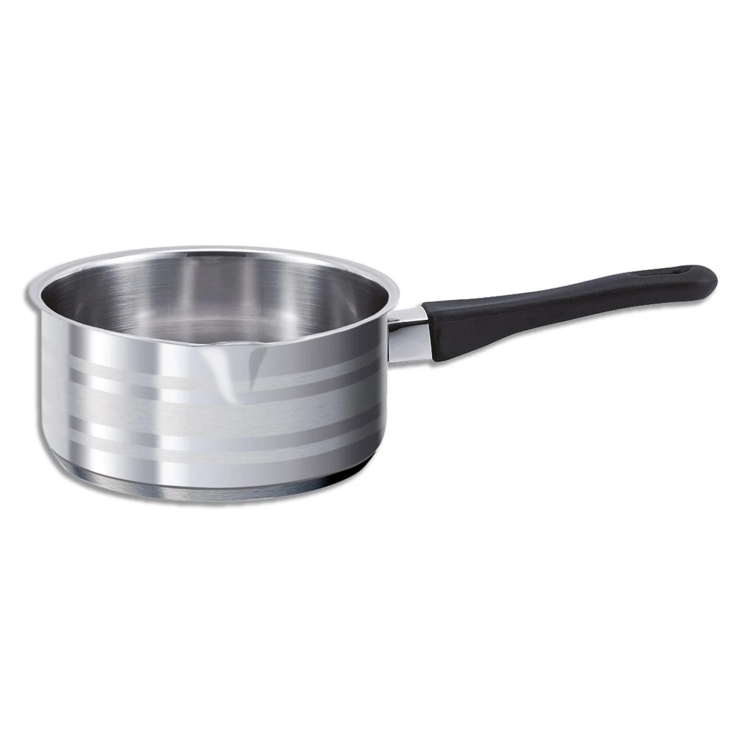 Kasserolle aus Edelstahl mit einem Fassungsvermögen von ca. 1,5 Liter. Die Kasserolle ist mit einem schwarzen Kunststoffgriff ausgestattet und hat einen Durchmesser von ca. 16 cm.