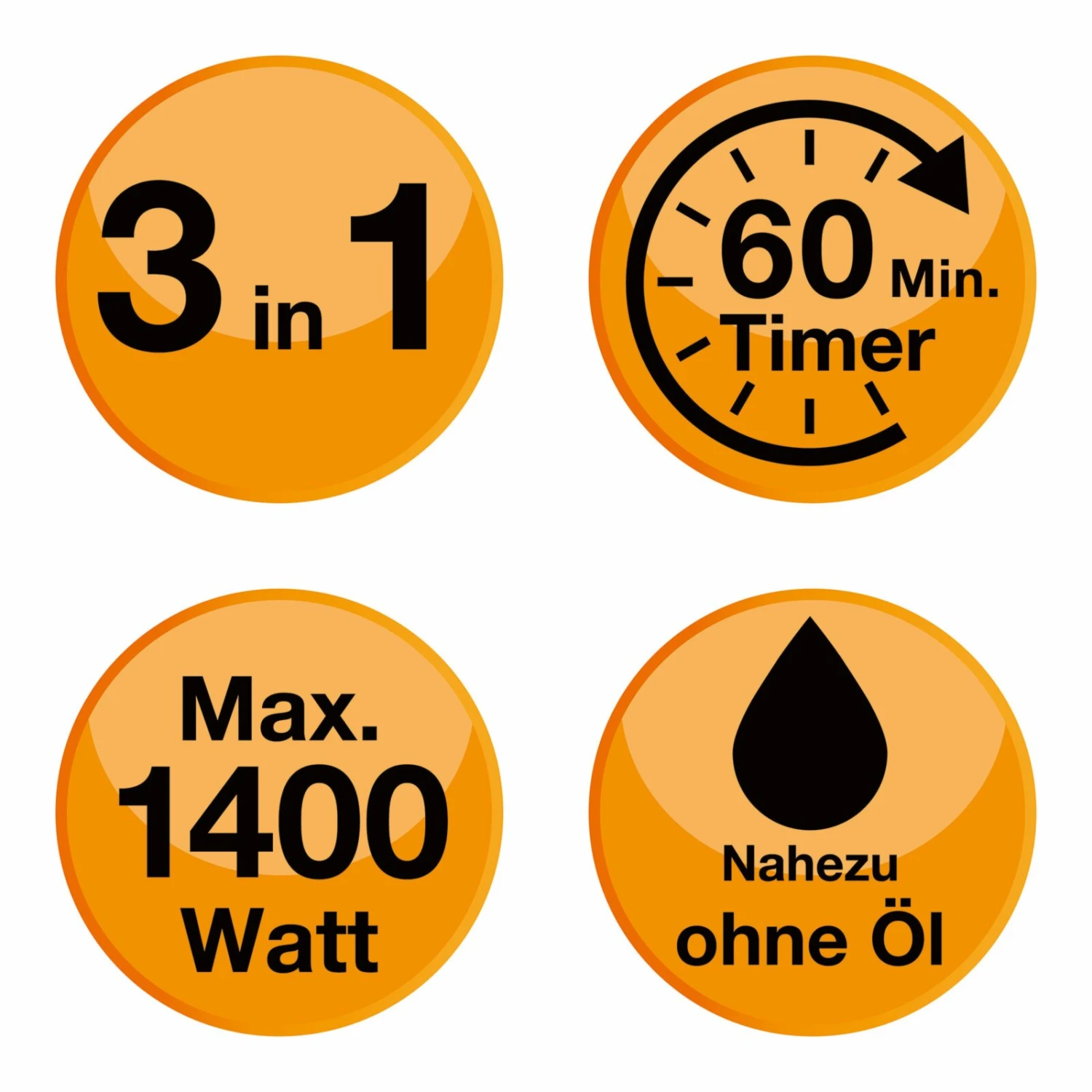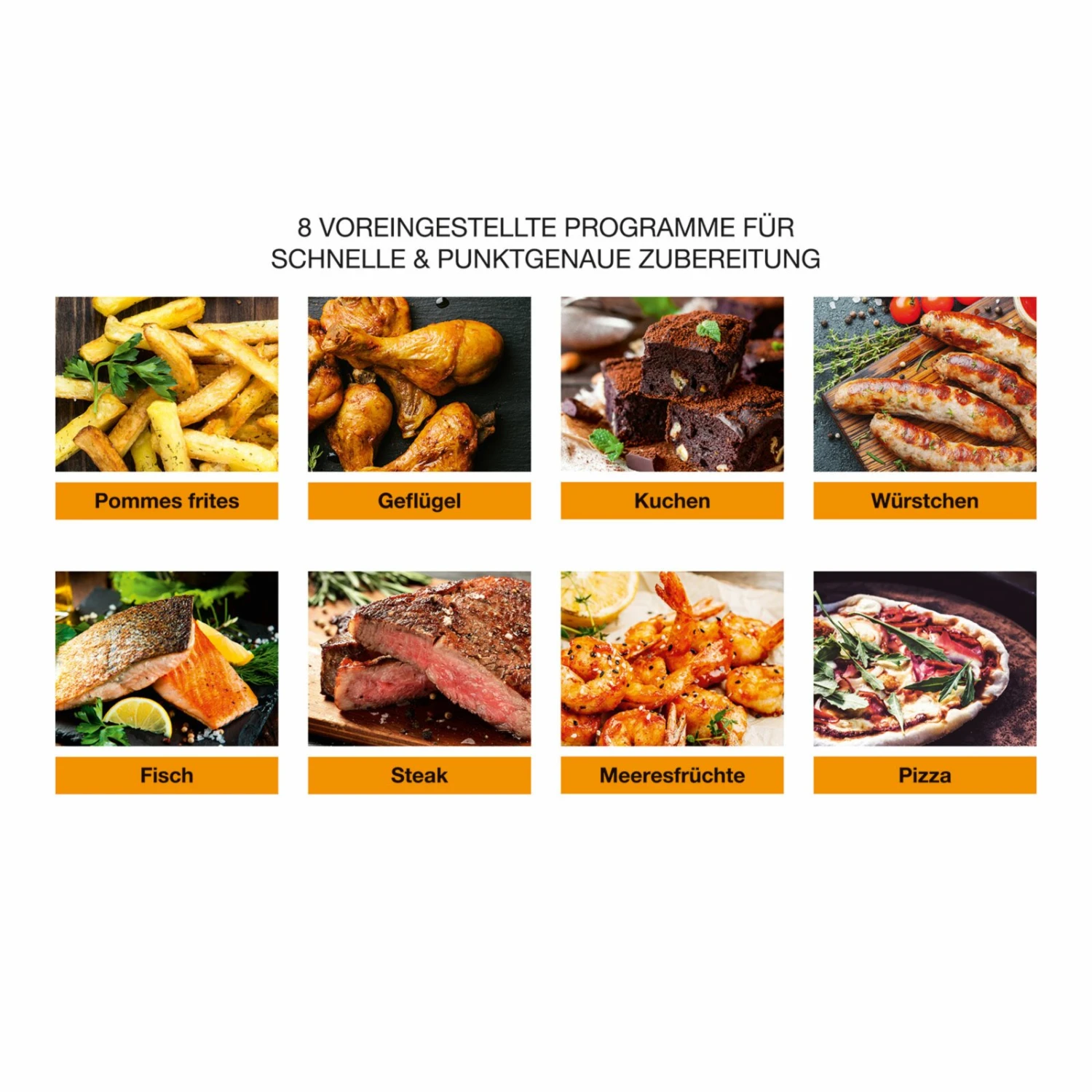 Mit der KOCHWERK Heißluft-Fritteuse können Sie Ihre liebsten Speisen fett- und geruchsarm frittieren. Dabei bleiben Snacks wie Pommes oder Nuggets trotzdem genauso knusprig wie bei einer herkömmlichen Fritteuse. Mit der Timer-Funktion können Sie die gewünschte Backzeit individuell einstellen und müssen so nicht die Uhr im Blick behalten. Mit den acht verschiedenen Programmen können Sie eine Vielzahl von Gerichten zaubern.