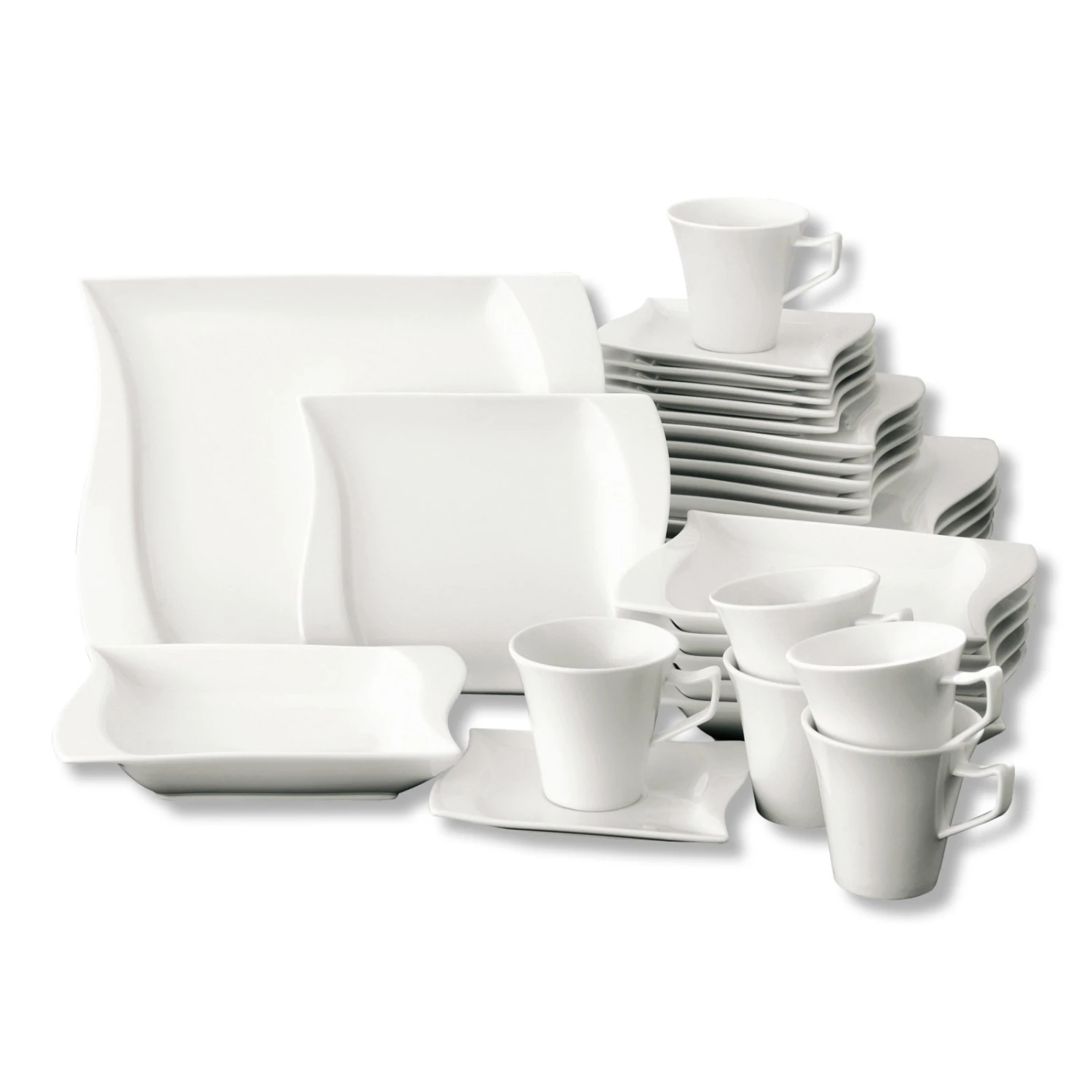 Das Kombiservice bestehend aus 30 Teilen besticht durch die ganz besondere Eleganz. Dieses Service macht Ihren Esstisch zum einladenden Blickfang. Die Form Der Teller ist eckig und die Tassen haben eine runde Form.