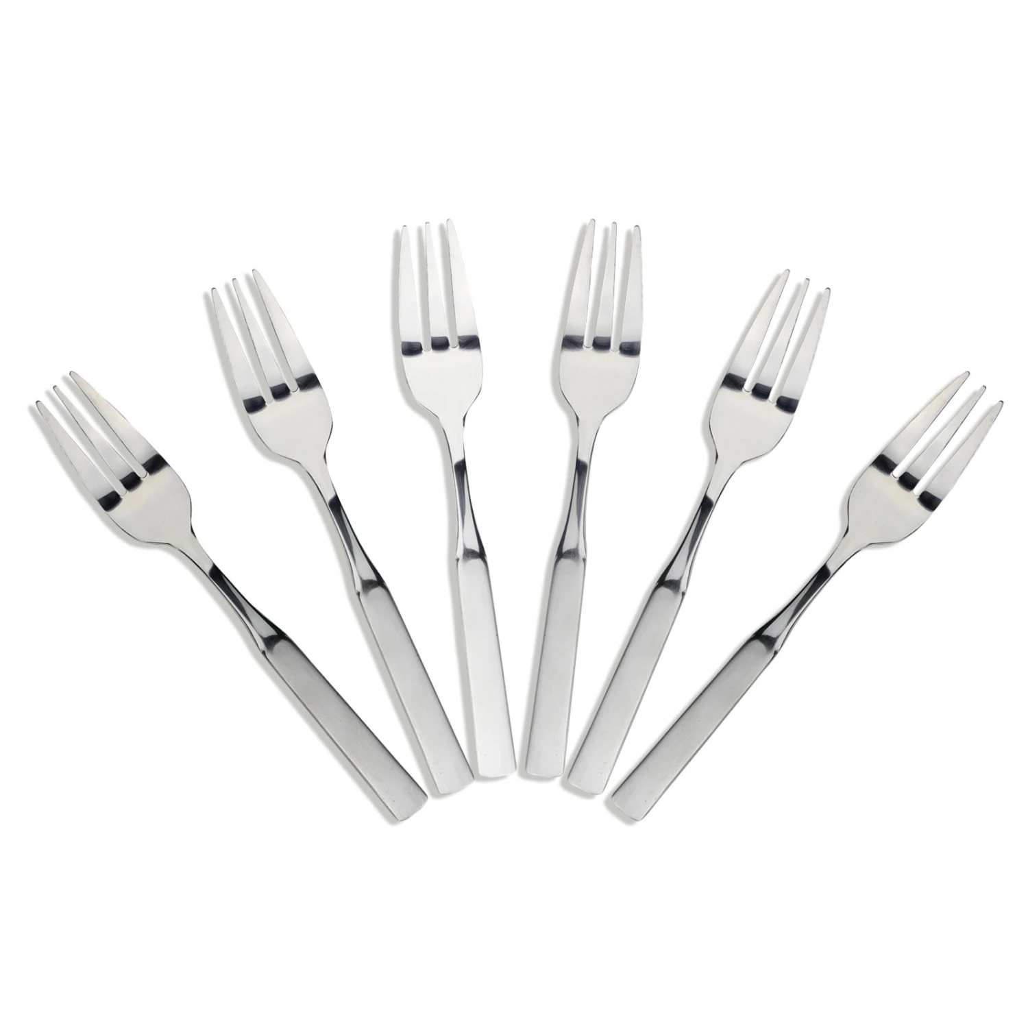 Sechs praktische Kuchengabeln aus Edelstahl. Die Griffe sind satiniert und die Gabeln haben eine Länge von etwa 14 cm.
