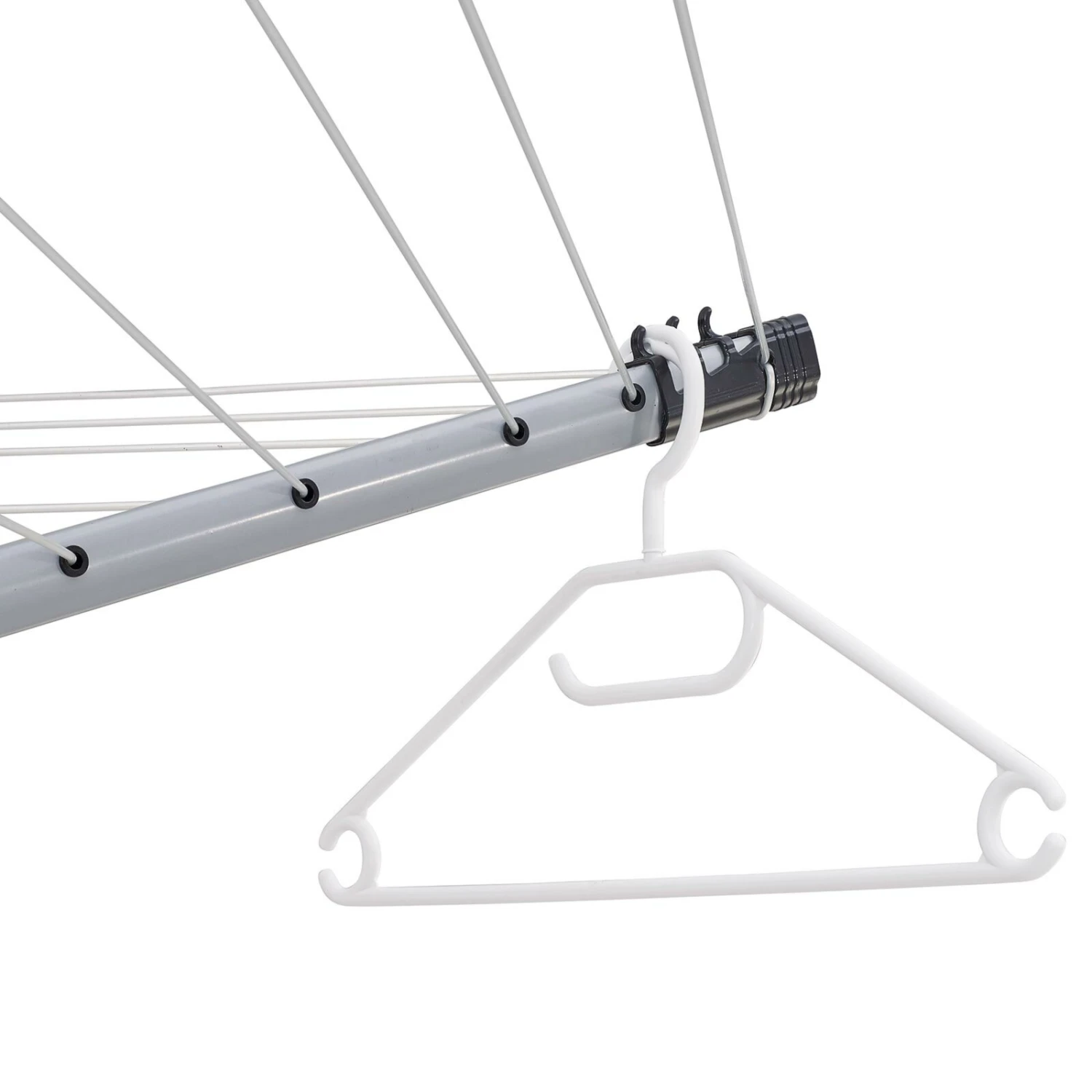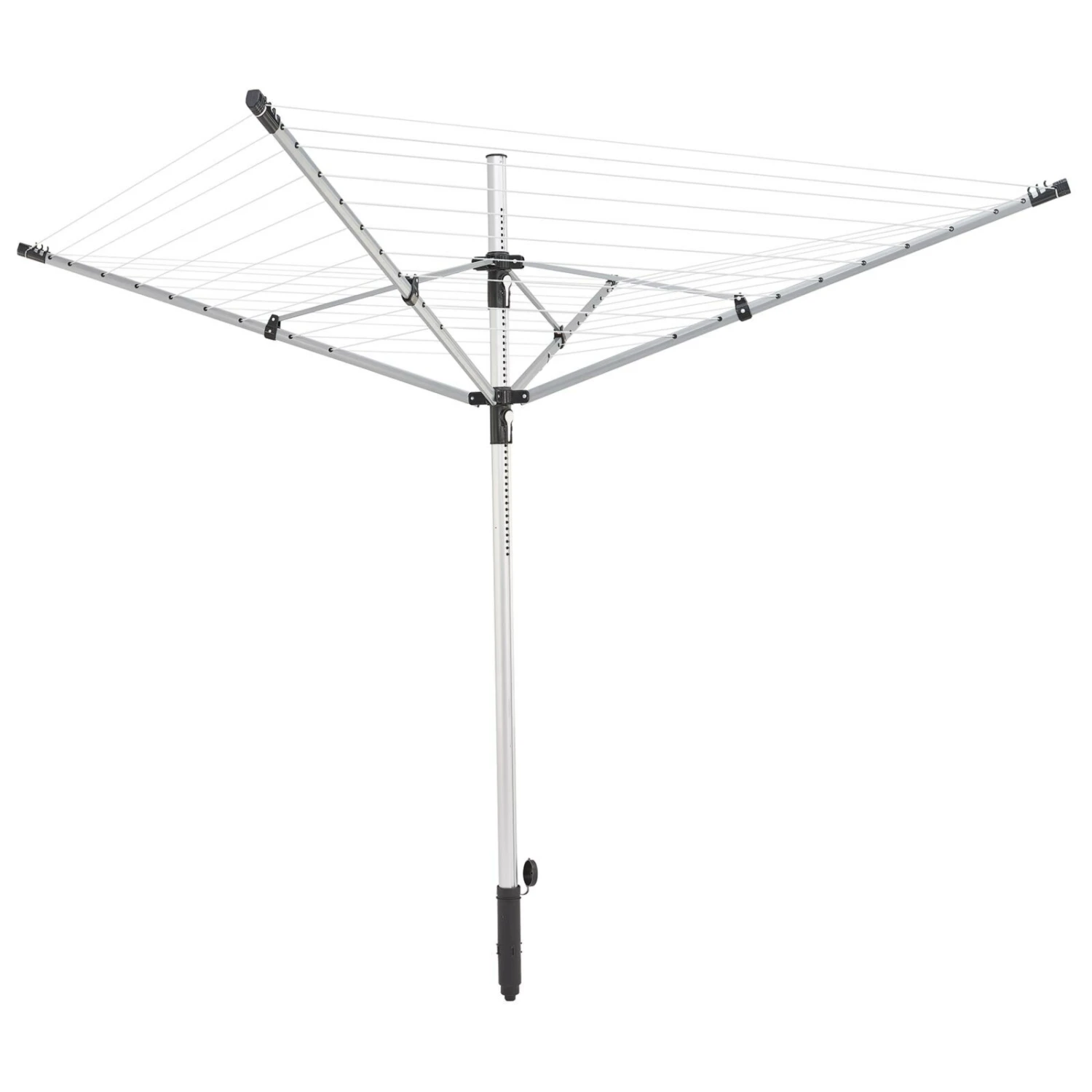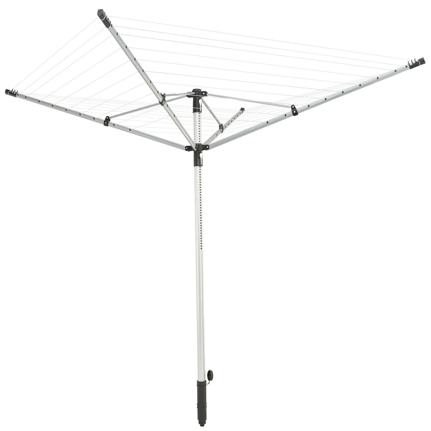 Diese praktische Wäschespinne bietet Platz für etwa fünf Wäscheladungen. Dank der Einrastautomatik können Sie den Schirm mühelos öffnen, ohne dass sich die Schnüre durch das Öffnungssystem verfangen. Die Höhe der Leinen kann wahlweise zwischen 1,35 und 1,8 Metern individuell eingestellt werden. Die Stützarme und ein massiver Mittelpfosten aus Metall sorgen dafür, dass die Spinne auch bei voller Beladung mit Ihrer Wäsche stabil bleibt.