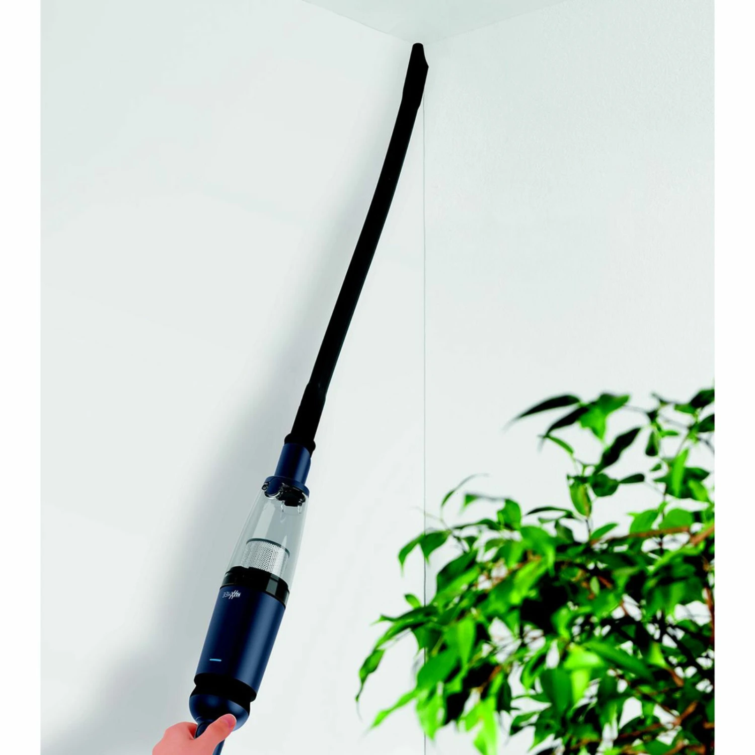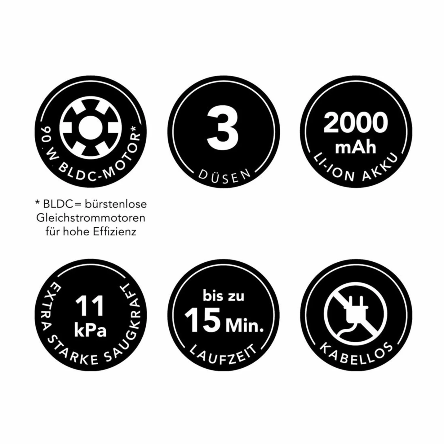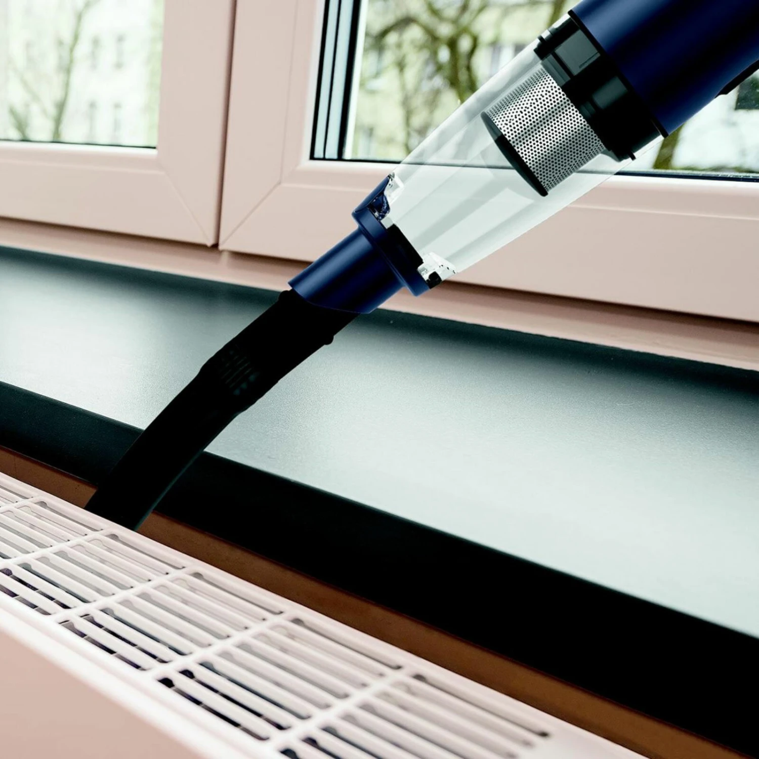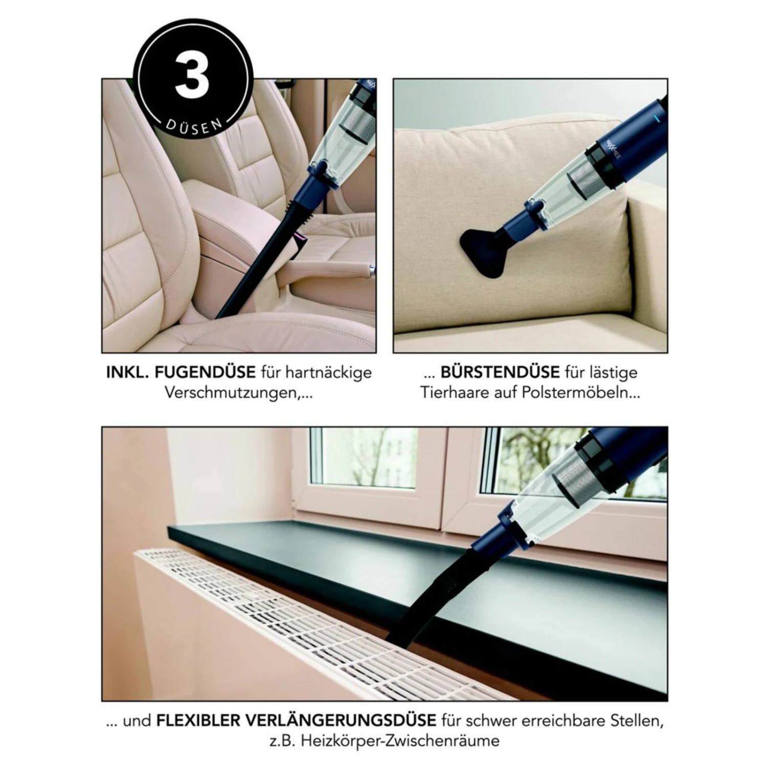 Der flexible und rund 520 g leichte Handsauger überzeugt mit Saugkraft und seinem starken Akku. Ausgestattet mit einem BLDC-Motor erreichen Sie eine hohe Saugleistung, mit der Sie auch schwer erreichbare Stellen, wie beispielsweise Polsterzwischenräumen, wirksam von Staub und Schmutz befreien. Die verschiedenen Düsen unterstützen Sie dabei: Die Fugendüse eignet sich vor allem für schwer erreichbare Flächen, die Bürstendüse entfernt zum Beispiel Tierhaare und mit der Verlängerungsdüse lassen sich sogar für Spinnweben an der Decke einsetzen. Der kabel- und beutellose Akkustaubsauger hat außerdem einen HEPA-Filter und unterstützt so auch bei einer pollen- und staubfreien Raumluft.