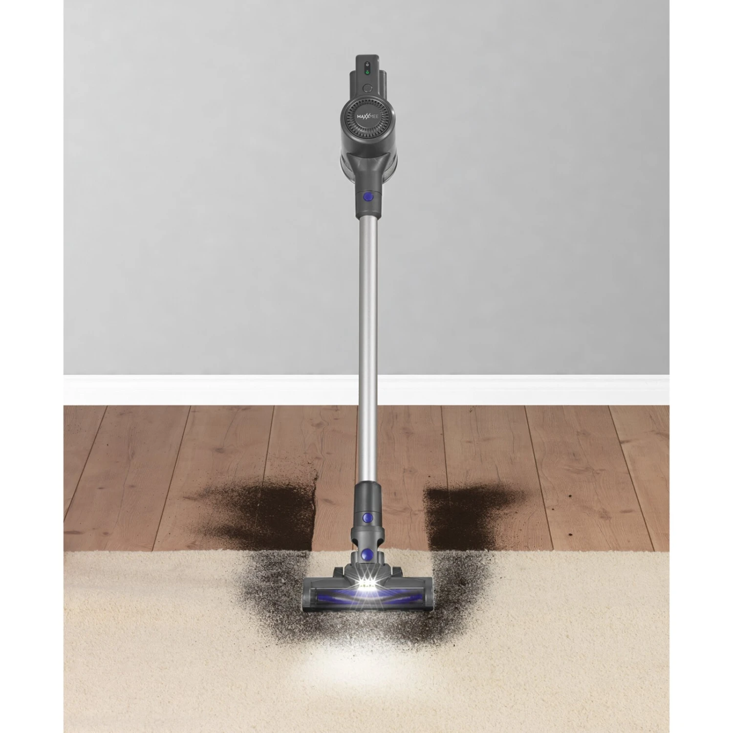 Der MAXXMEE Hand- & Bodenstaubsauger ist besonders flexibel einsetzbar aufgrund der Kabellosigkeit und ist zudem leise, leicht und komfortabel. Mit dem Verlängerungsrohr aus Metall und den 3 Aufsätzen kannst du ihn individuell einsetzen. Die Abluft wird 3-fach gefiltert, sodass Allergiker diesen Staubsauger ideal verwenden können. Die Bodendüse löst mit elektrisch rotierenden Borsten selbst festsitzenden Schmutz und Tierhaare. Mit der LED-Beleuchtung kann der Staub dir auch unter Möbeln nicht entkommen.