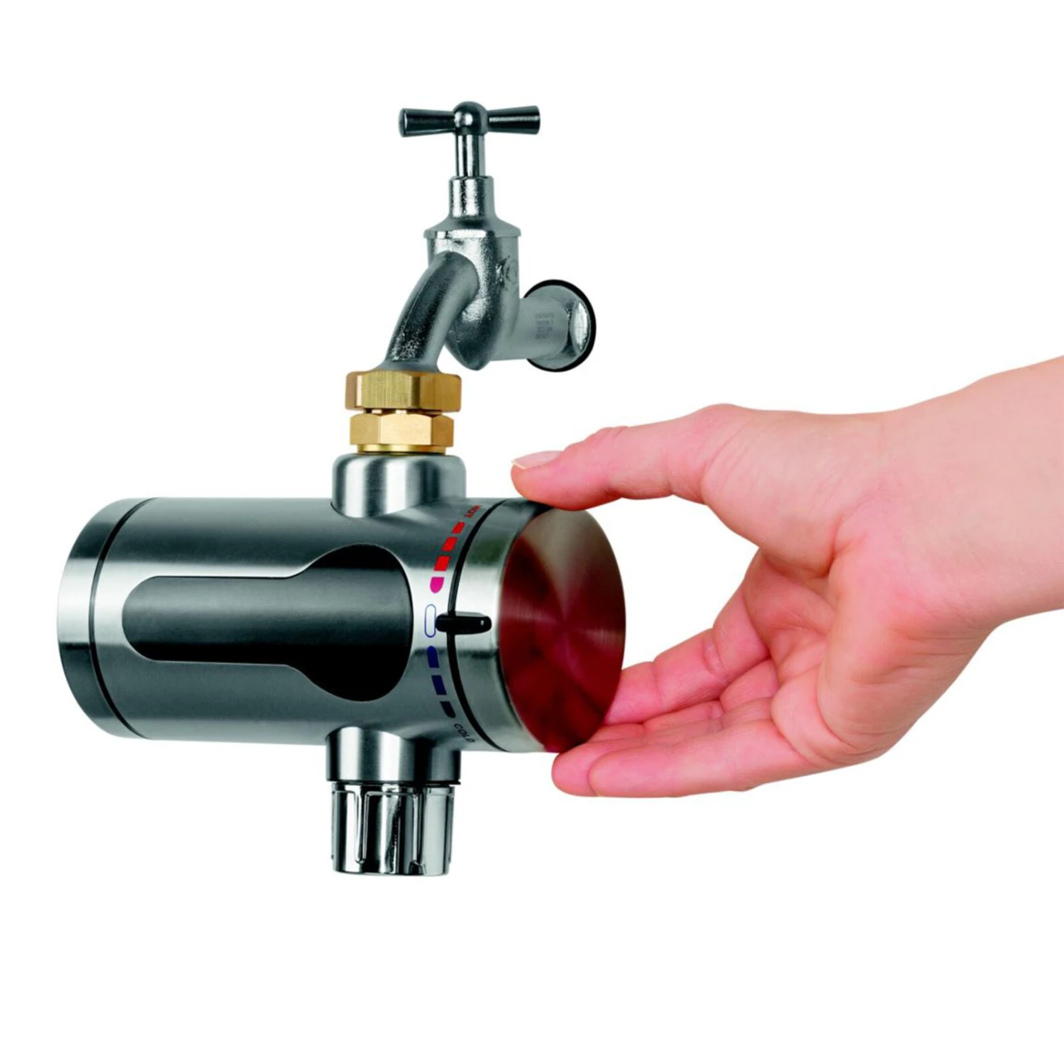 In dem kompakten, elektrischen Durchlauferhitzer ist eine starke Heizspirale enthalten, mit der Sie ohne langes Vorheizen je nach Wasserdruck in Sekunden warmes Wasser von bis zu ca. 60°C erhalten. Bequem und praktisch unter anderem für den Pool, die Gartendusche oder das Camping. Sie benötigen nur einen Wasser- und Stromanschluss, und schon ist der Durchlauferhitzer aus wertigem Edelstahl installiert: Anschrauben, Stecker rein, los. Die genaue Temperatur wird jederzeit an der digitalen LED-Anzeige angezeigt.