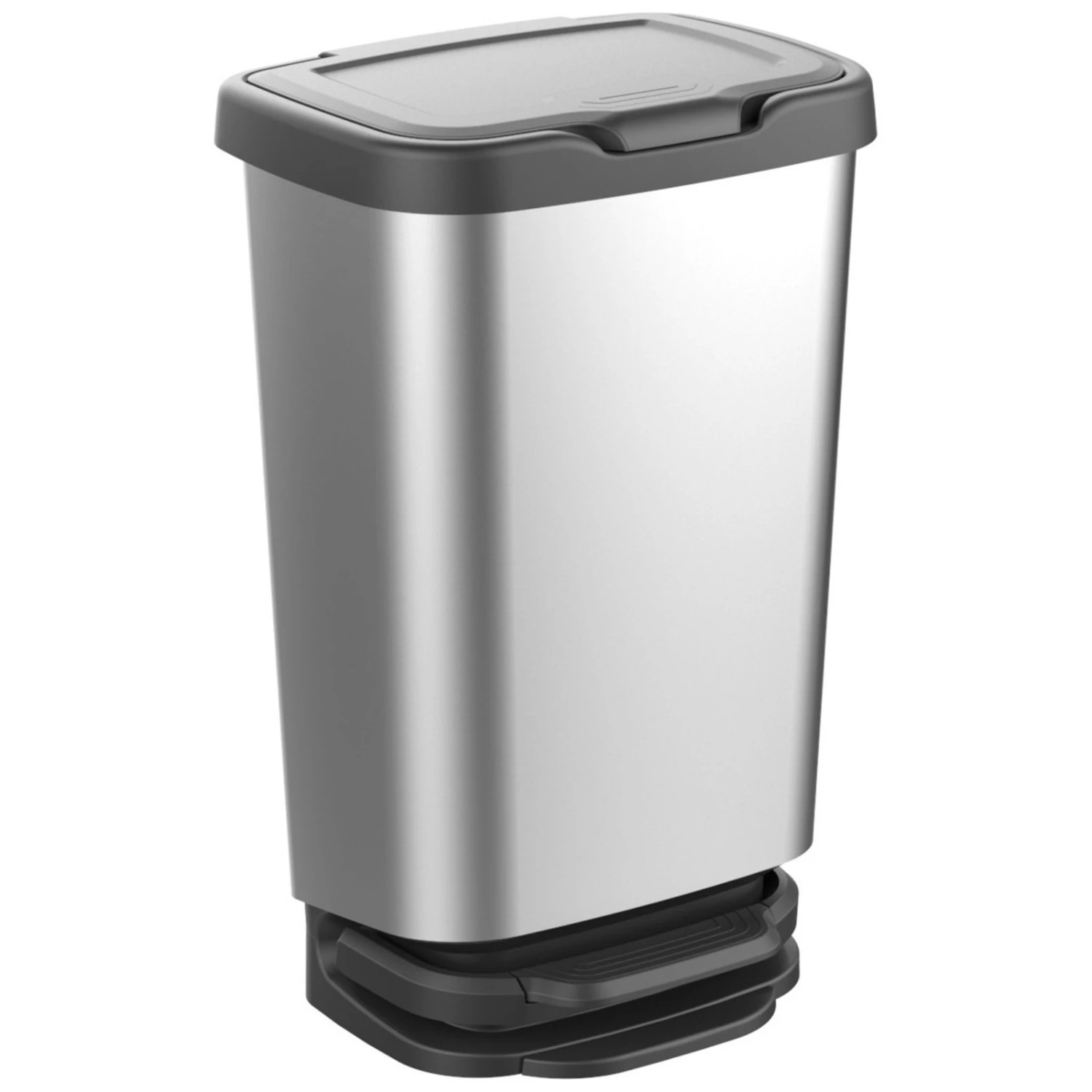 Dieser 40 Liter umfassende Mülleimer in schicker Alu-Optik lässt sich besonders praktisch mit dem Fuß öffnen. Der Deckel schließt sich dabei sehr sanft und durch die Antirutschfüße rutscht er beim Befüllen nicht weg.
