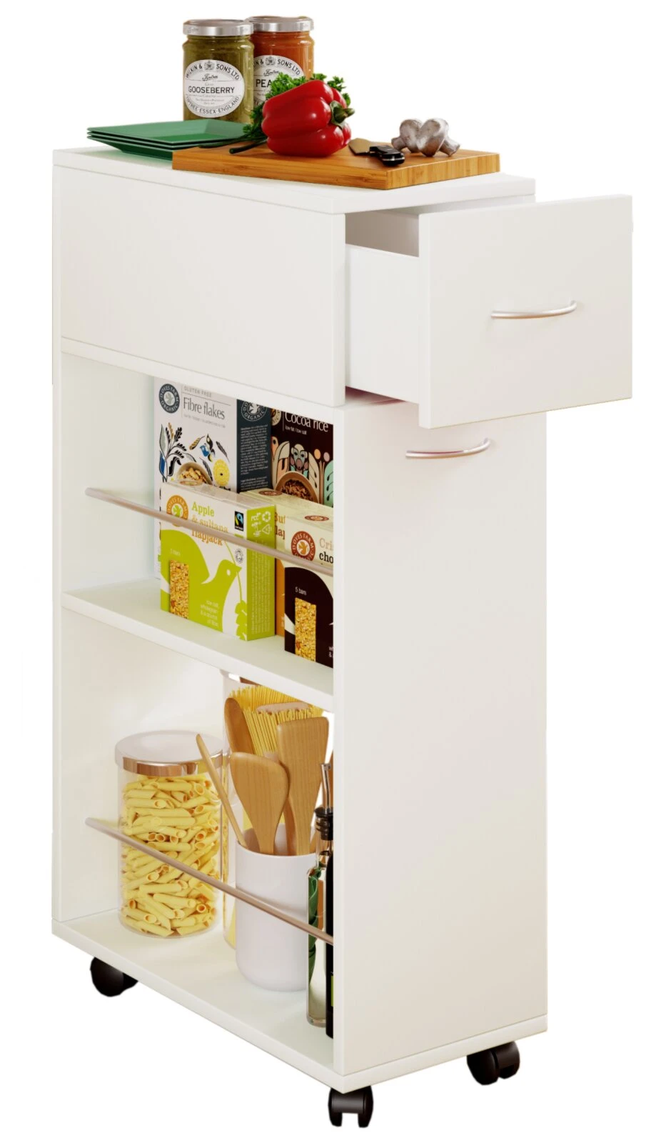 Dieser praktische Nischenwagen in Weiß verfügt über einen Schubkasten und zwei Böden, sodass du genügend Stauraummöglichkeiten für deine Küchenutensilien hast. Außerdem ist der Wagen auf Rollen, damit du ihn je nach Belieben und Wünschen wegschieben kannst.