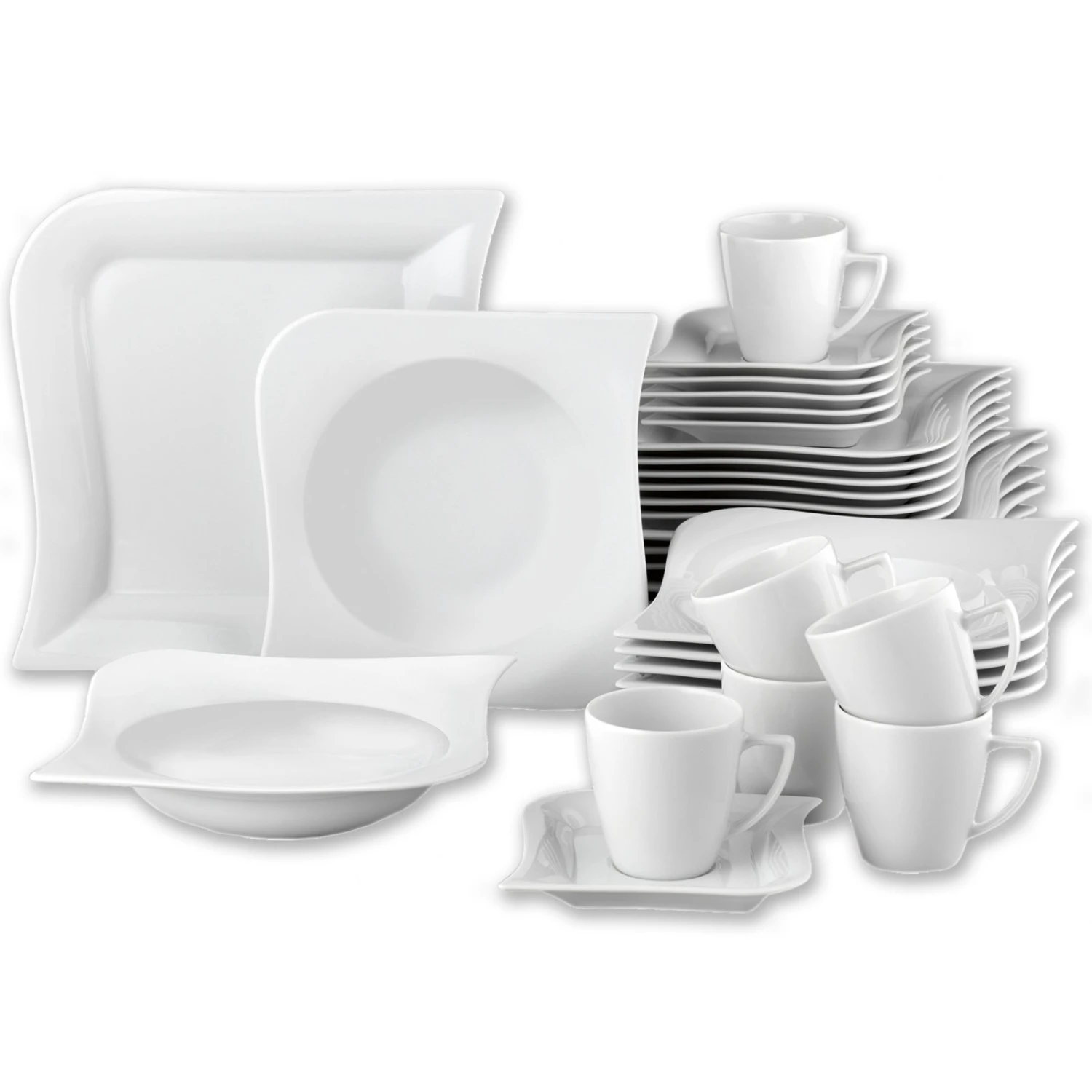 Dieses umfangreiche Porzellan Service ist in einem sehr stilvollen und schlichten Weiß gehalten und sorgt gleichzeitig dank der eckigen Form für ein modernes Design. Einem Essen für 6 Personen steht Ihnen jetzt nichts mehr im Wege, denn mit diesem Service können Sie Vorspeise, Hauptgang und Nachspeise anrichten. Zudem ist es sowohl spülmaschinenfest, als auch mikrowellengeeignet.