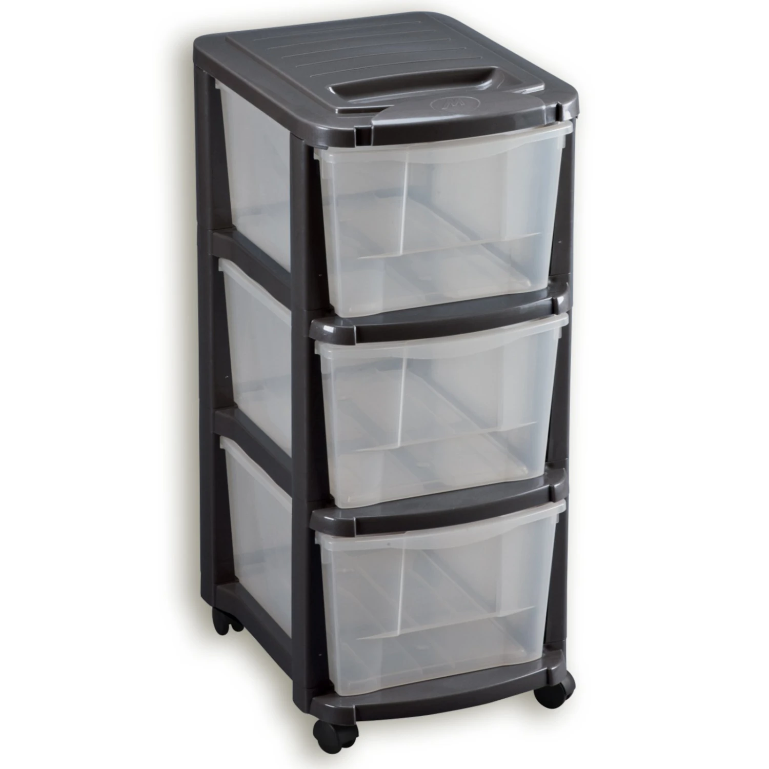Dieser anthrazitfarbene Schubladencontainer ist ein fabelhaftes Allround-Talent. Egal ob im Keller, in der Küche oder im Büro, die transparenten Schubkästen sorgen für Ordnung und bieten jede Menge Stauraum. Dank der Rollen lässt sich der Turm ganz einfach verschieben.