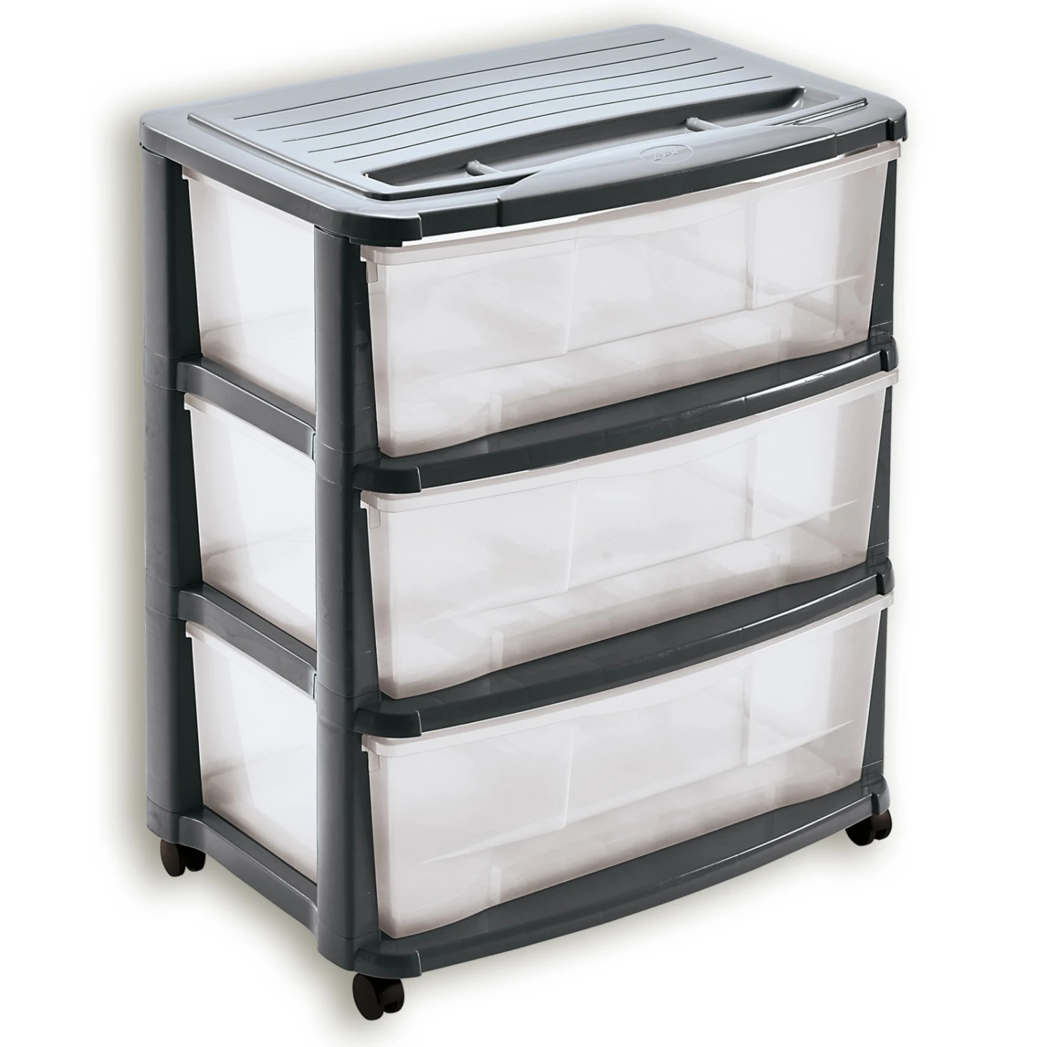 Dieser anthrazitfarbene Schubladencontainer bietet Ihnen viele Einsatzmöglichkeiten. Egal ob in Küche, im Büro oder Keller, der Turm mit drei transparenten Schubkästen verfügt über reichlich Stauraum und schafft Ordnung. Die Rollen ermöglichen ein einfaches Verschieben und das ohne großen Kraftaufwand.