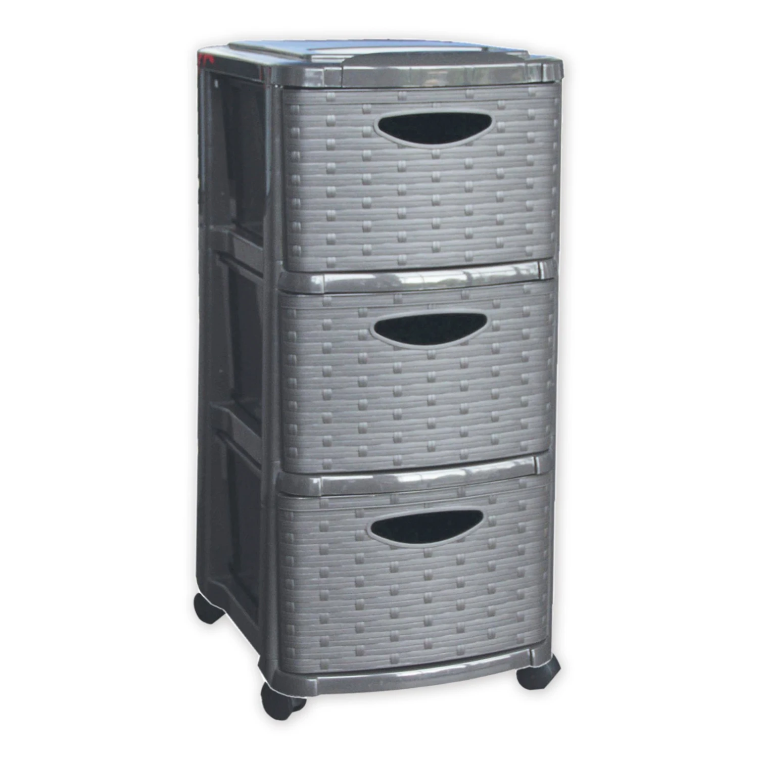 Hellgrauer Schubladencontainer aus Kunststoff in stylischer Rattanoptik. Dieser Container besteht aus drei übereinanderliegenden Schubkästen, in denen Sie einige Utensilien unterbringen können. Zudem ist dieser Schubladenturm auf praktischen Rollen gebaut und somit flexibel stellbar.