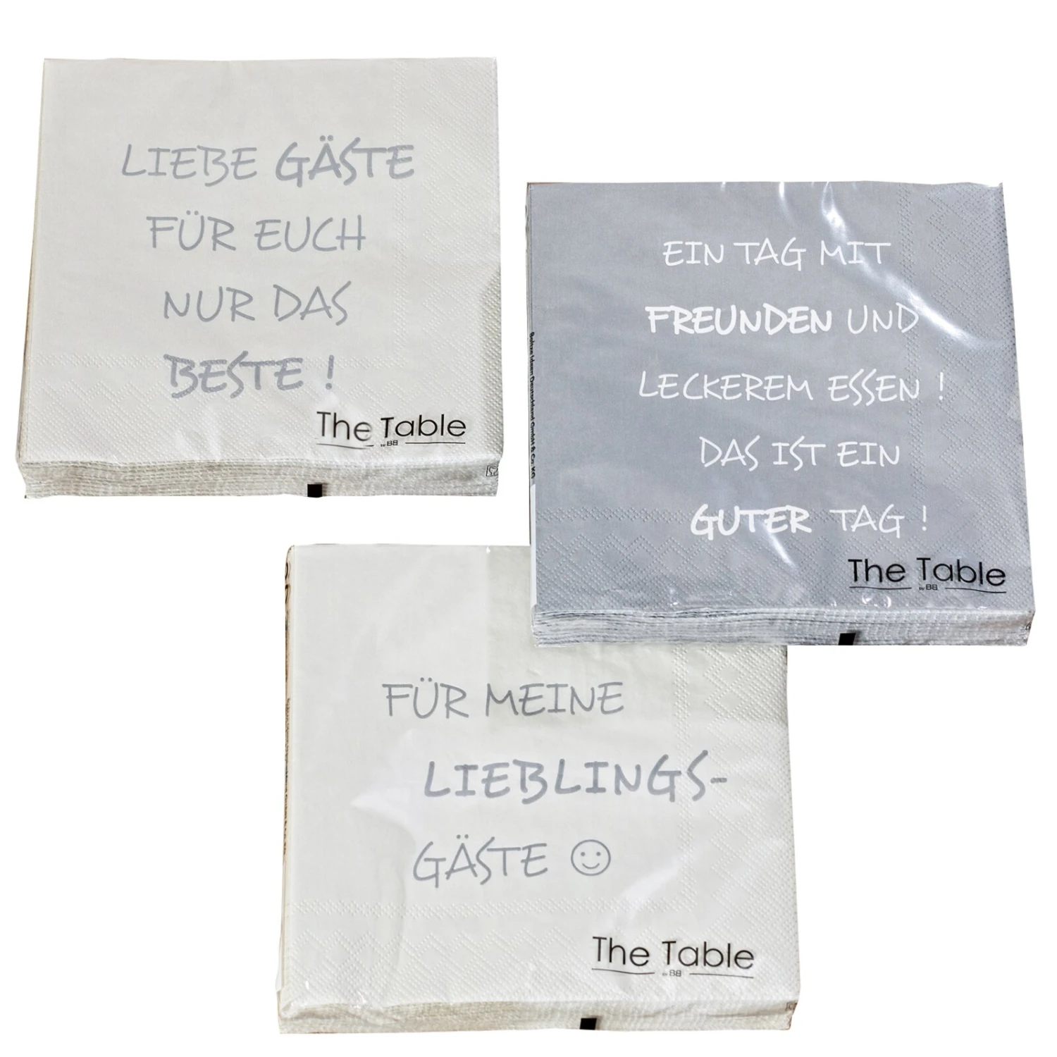 In Ihrem nächstgelegenen ROLLER-Markt können Sie bei diesen schönen Servietten zwischen verschiedenen Sprüchen wählen. Die graue Farbgebung kann zu den verschiedensten Tischdekorationen kombiniert werden.