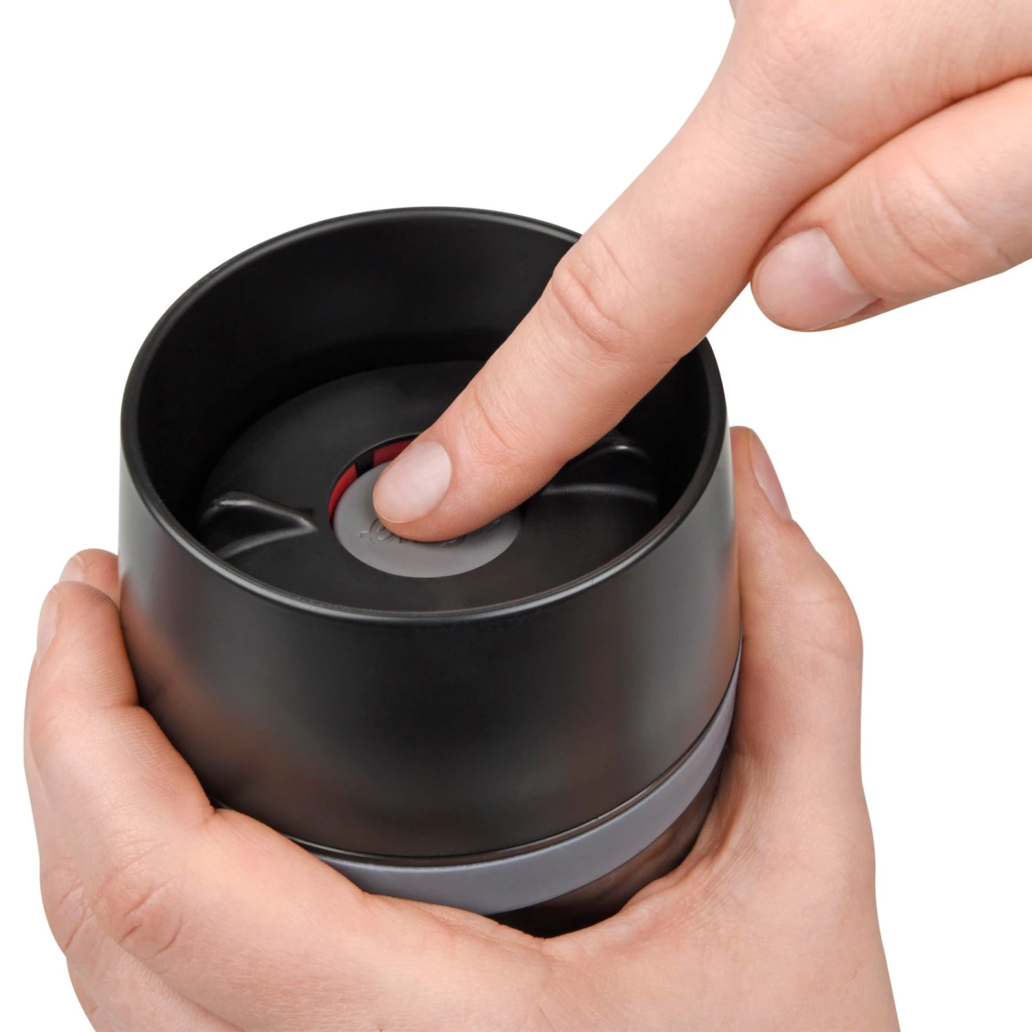 Der Thermobecher hat eine schlanke Bechertaille, so dass das Rutschen in der Hand verhindert wird. Zudem macht ihn das passend für die gängigen Autohalterungen, damit er Sie begleiten kann. Dank der 360° Trinköffnung müssen Sie nur mit einem Fingerdruck den Verschluss öffnen und können Ihr heißes Getränk von allen Seiten genießen. Das nervige Öffnung suchen entfällt! Im Oberkorb der Spülmaschine kann er einfach gereinigt werden, um stets einsatzbereit zu sein.