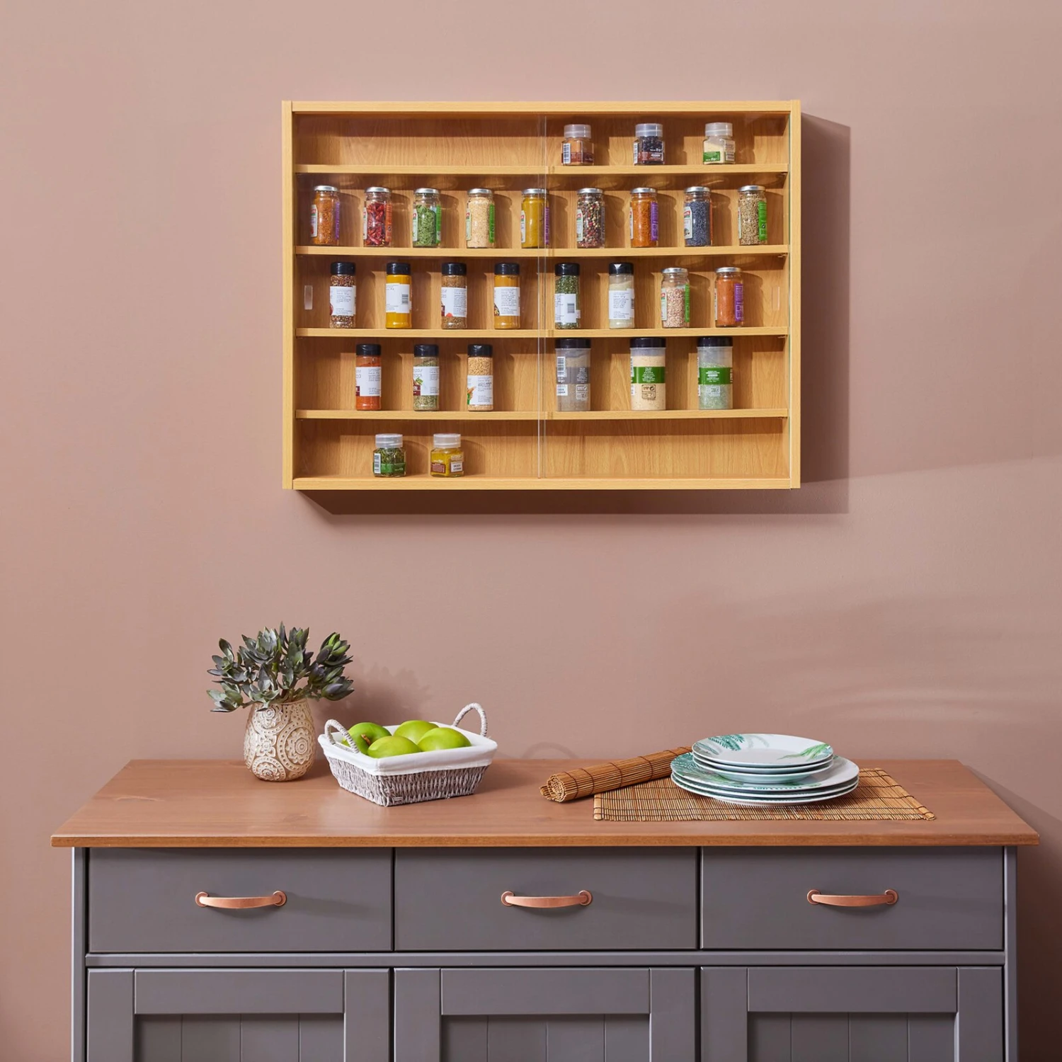 Zeitlose Vitrine in Buche Nachbildung mit fünf Fächern und Scheiben aus Sicherheitsglas. Schützt Ihre persönlichen Sammlungen bestmöglich vor Schmutz und Staub. Durch die seitlich verschiebbaren Scheiben ist die Vitrine platzsparend und passt selbst in kleinere Räume.