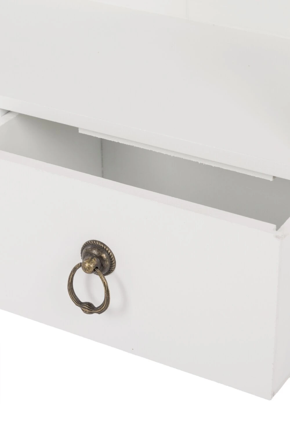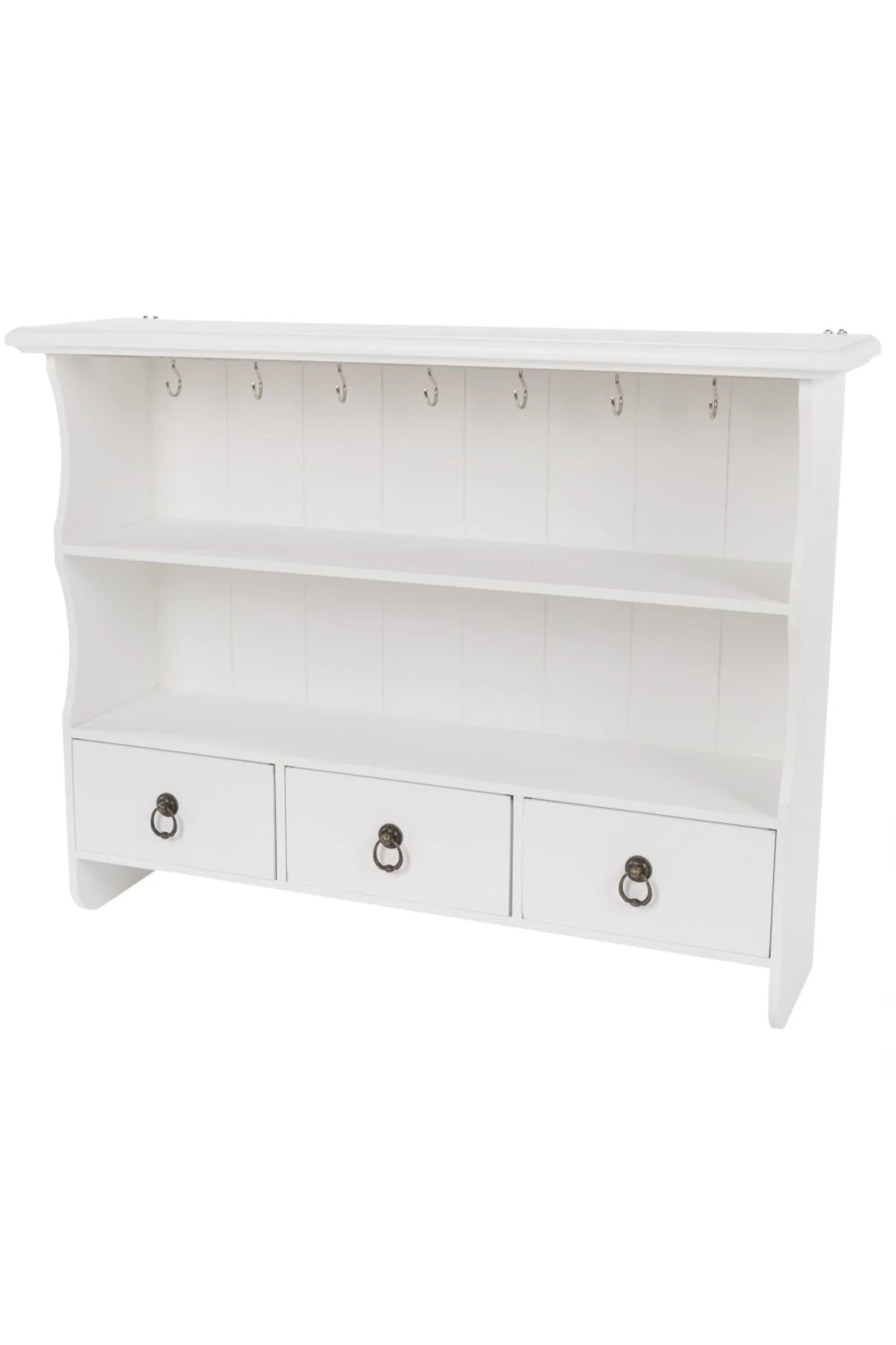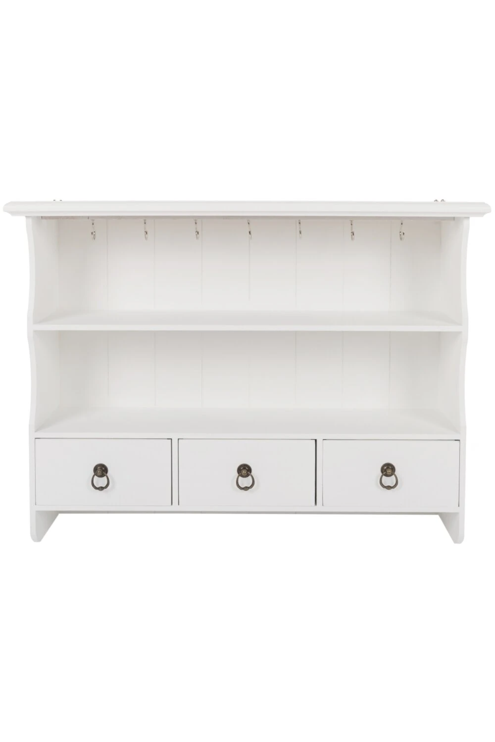 Dieses schöne Wandregal überzeugt durch seine charmante Optik im Landhausstil. Das weiße Regal besitzt eine Rückwand im Paneel-Design, sowie zwei offene Fächer und drei Schubkästen mit Kassettenfront und Ringgriffen. Zusätzlich unterstreichen Ringhaken zur praktischen und stilvollen Aufbewahrung das verspielte Design.